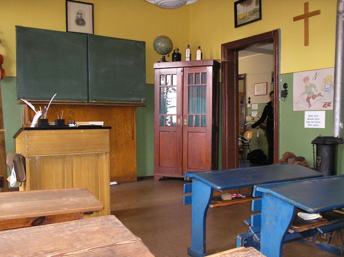 Unterricht wie vor 100 Jahren: "Hände falten, Schnabel halten, Kopf nicht stützen, Ohren spitzen". So begann der Unterricht am Anfang des 20. Jahrhunderts. Je Klasse wurden etwa 52 Schüler untergebracht. Bänke und Tische waren je nach Klassenstufe unterschiedlich groß und eng. Kleine Schüler saßen vorne, große hinten, damit jeder einen guten Blick auf den Lehrer hatte. In jedem Klassenzimmer stand ein Spucknapf. Dieser hatte eine ähnliche Funktion wie ein Taschentuch. Um die Klassenräume im Winter warmzuhalten standen Öfen in der Schule verteilt. Während der NS- Zeit musste in jedem Zimmer ein Bild von Adolf Hitler aufgehangen und eine Büste hingestellt werden.