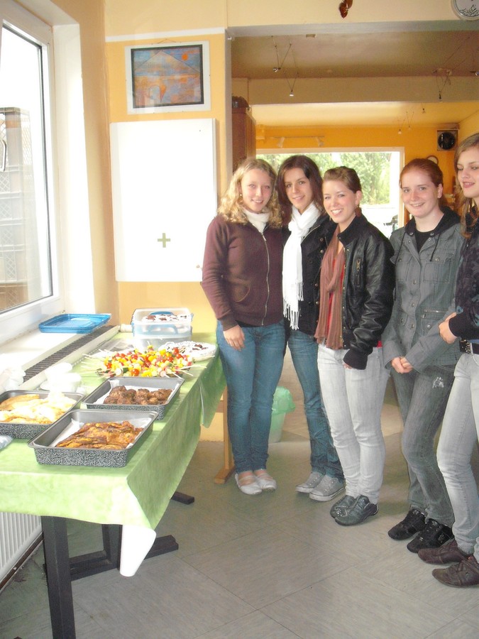 Morgens um 10 Uhr, trafen wir uns in der Schulküche und begannen erst einmal mit der Einteilung der Gruppen. Jeweils 3-4 Leute bereiteten zwei Stunden lang eines der insgesamt vier Gerichte vor: Kartoffel-Möhrenpuffer, Dip-Saucen, Brownies, Gemüsespiesse, Schafskäseteigtaschen und Fleischfrikadellen. Als wir mit der Zubereitung fertig waren und die Gerichte abgepackt hatten, machten wir eine kleine Brotzeit, danach fuhren wir mit 7 Mann nach Walle in die "Tasse", eine Einrichtung für finanziell benachteiligte BremerInnen.