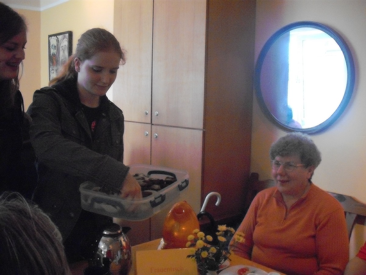 Die anfängliche Unsicherheit verschwand schnell und die Leute griffen dankbar zu, wahrscheinlich auch, weil die eherenamtlichen Mitarbeiterinnen uns am Anfang erst einmal vorgestellt, und erklärt hatten, dass wir etwas Selbstzubereitetes mitgebracht hatten. Die Leute aßen und lobten unsere Arbeit immer wieder, und sogar mit den Fotos hatte später keiner mehr Probleme.